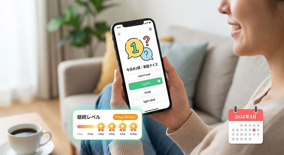 毎日1問だけ、4択の英語クイズが出題されます。これなら「勉強」へのハードルが劇的に下がりますよね。 しかも、あなたの現在の英語レベルに合わせて、AIが自動で問題を作成してくれます。「難しすぎて自分には無理…」と挫折する心配がありません。